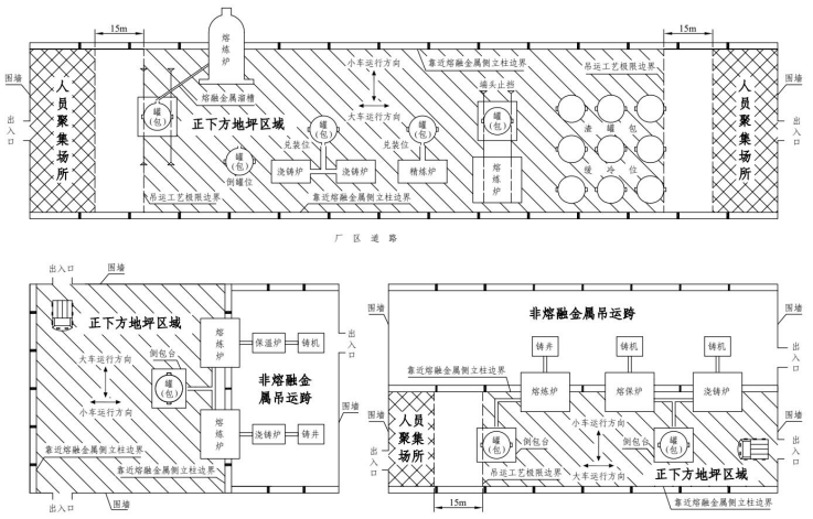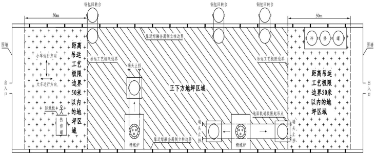 (2)炼钢厂、铁合金厂的会议室、活动室、休息室、操作室、交接班室、更衣室(含澡堂),设置在熔融金属吊运跨距离吊运工艺极限边界50米以内的地坪区域(纵向两端方向,图4-3)。