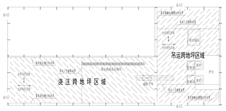(1)“地坪区域”是指横向以铁水、钢水、液渣(以下简称“熔融金属”,冶金企业下同)吊运跨两侧立柱靠近熔融金属吊运侧的立柱边线为界,纵向以吊运跨两侧围墙为界的车间内零米地面区域。其中,横向是指吊运熔融金属起重机的小车运行方向;纵向是指吊运熔融金属起重机的大车运行方向(图4-1)。