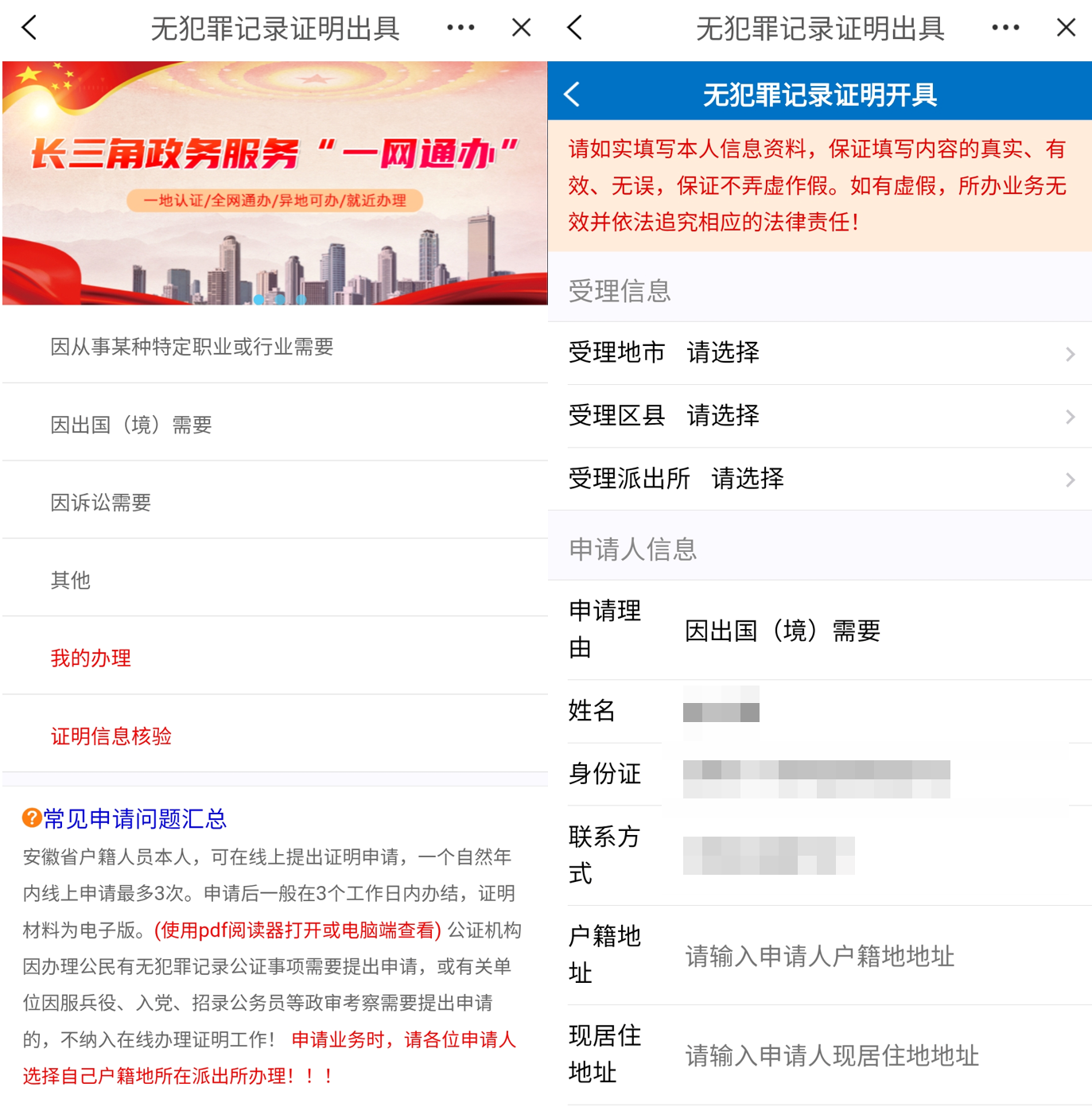 根据实际情况选择开具无犯罪记录证明的具体原因,以“因出国(境)需要”为例,点击进入后填写“受理信息”及“申请人信息”并上传身份证照片,最后提交申请即可完成在线申办。