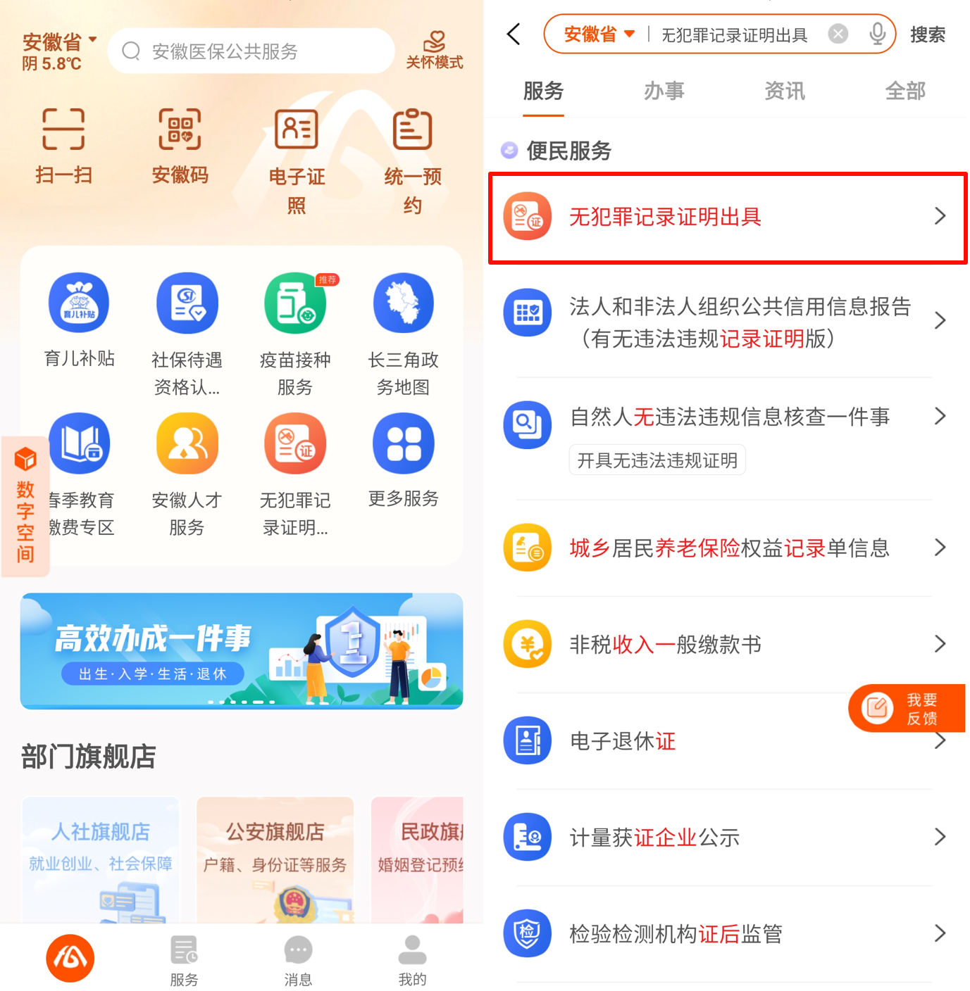下载“皖事通”APP并注册登录,首页搜索“无犯罪记录证明出具”,点击进入。