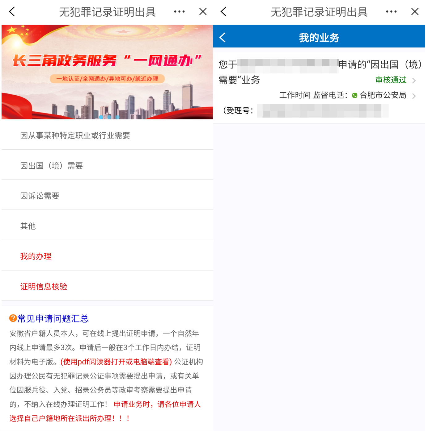 在线提交申请后,在办理页面选择“我的办理”,可在线查看申办进度。办理成功后证明材料为电子版,可自行下载打印。