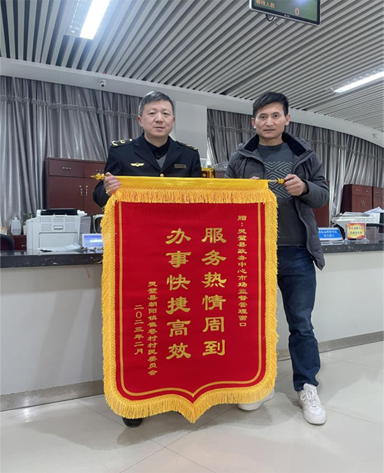 “现在老百姓办事是真的方便,前期我向企业开办窗口工作人员询问了一下办理农民专业合作社的相关事宜,电话里面工作人员详细和我说明了办理流程,但是由于办理手续较为复杂,工作人员说明情况后我也不清楚如何办理,在了解到情况后,工作人员主动提出可以帮我全程免费代为办理。”近日,灵璧县朝阳镇崔巷村崔先生来到灵璧县政务服务中心企业开办窗口向窗口负责人送上一面锦旗,并为窗口工作人员热情服务点赞。
