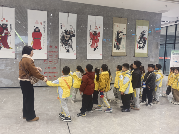 自助服务区域成为萌娃们的“探索天地”。讲解员耐心指导萌娃们和“AI咨询数字人”对话,手把手教他们通过触摸屏查看大厅“政务服务地图”,萌娃们亲手尝试,脸上满是新奇与喜悦。此外,萌娃们还化身“小小群众”,模拟提交材料、咨询问题的场景,在沉浸式体验中感受办事流程的严谨,培养了规则意识和沟通能力。随后,萌娃们来到大厅两侧的钟馗画展区。讲解员结合灵璧钟馗画的文化底蕴,用生动的故事讲解画作的寓意与特色,孩子们目不转睛地欣赏着一幅幅色彩鲜明、形象生动的钟馗画,好奇地询问画作细节,在潜移默化中感受家乡传统文化的博大精深。