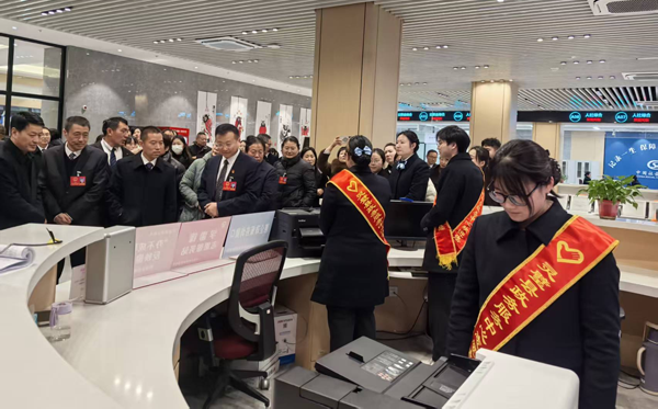 在企业服务专区,人大代表和政协委员们详细了解企业开办“一站式”服务、工程建设项目“一窗受理”等改革举措的实际运行情况。步入“书画长廊”,人大代表和政协委员们驻足欣赏本地艺术家与群众创作的作品,在钟馗画前感受画中蕴含的正气与担当,体会政务服务环境中融入人文艺术、提升服务温度的创新做法。