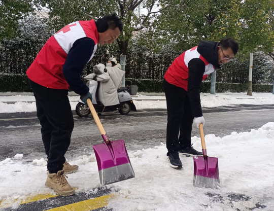 活动现场,志愿者身着红十字标识马甲,手持铁铲迅速集结、分工协作。尽管寒风裹挟着残雪扑面而来,但队员们无惧严寒、干劲十足,弯腰挥锹、奋力铲雪,铁铲与地面的撞击声、队员们的互助吆喝声,在冬日街头交织成温暖人心的奉献乐章。