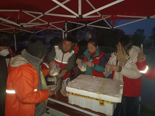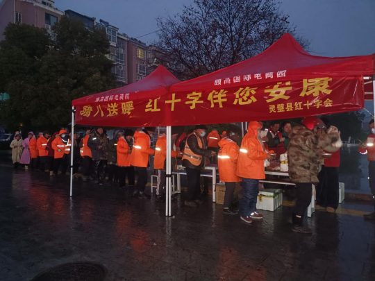 1月26日腊月初八清晨,寒雨淅沥,灵璧县鹿鸣广场、宏泰广场的帐篷下却涌动着融融暖意。灵璧县红十字会组织县红十字志愿服务队和救援队开展主题为“传承腊八节 浓粥献真情”的志愿服务活动,20余位身着红马甲的红十志愿者冒雨坚守,用1000个热气腾腾的包子,500份香甜八宝粥与500个新鲜鸡蛋,为城区环卫工人、老年人等群体送上节日的关怀。