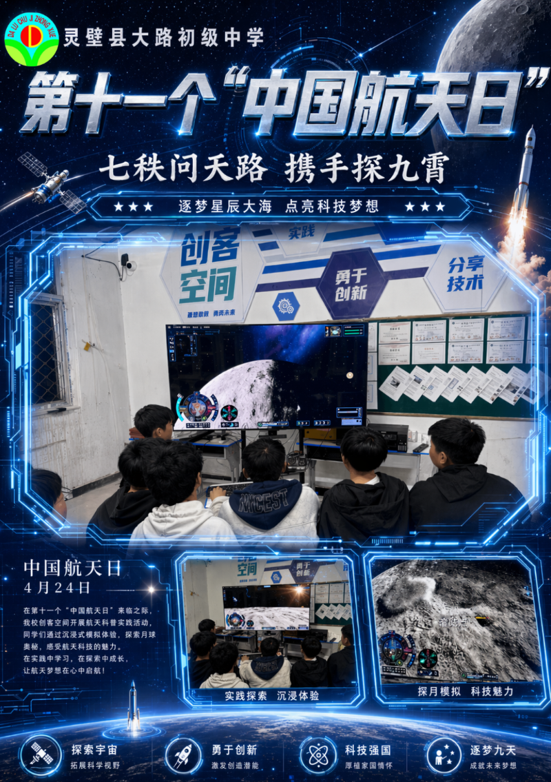 4月24日,是第十一个“中国航天日”。今年的主题是“七秩问天路 携手探九霄”。在这个属于星辰与梦想的日子里,灵璧县大路初级中学以学校创客空间为阵地,开展航天日主题宣传与科技体验活动,引导学生在仰望星空中厚植家国情怀,在动手实践中点亮科学梦想。