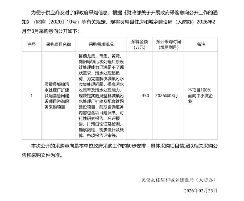 灵璧县住房和城乡建设局(人防办)2026年2月至3月政府采购意向
