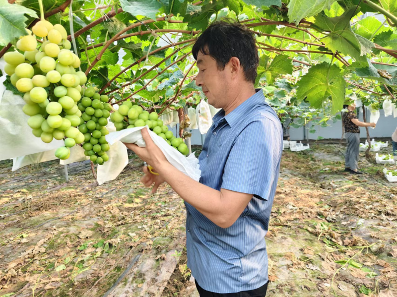 该村水果大棚合作社负责人陈义志,带领工人们正在摘去套袋,采摘下一串串葡萄,虽然棚内温高湿热,个个脸上都挂满了汗珠,当摘下一串串丰收的葡萄时,笑容赶走了汗珠。“这一大方阳光玫瑰葡萄大棚园,像这么大面积的全县只有我这一家,今年虽然市场价格下滑,但每亩产值七八千元还是能实现的,这么好的葡萄坐在家里就能销售出去,打个电话江苏的水果商家开车到棚前收购,每市斤都在13元,比其它品种价格还是高的,特别好卖,刚开园上市两天就销售获利20万元。”陈义志挥汗如雨说。正在向筐里分拣葡萄的徐州果商岳老板介绍:“这里土壤好,气候好,这像宝珠一样的阳光玫瑰葡萄徐州市民都爱吃,是最优质的绿色产品,全用有机肥,不用化肥,不仅美味可口,而且营养价值极高,含有氨基酸、维生素、矿物质等,能够有效地为人体所吸收,起到生津消食、缓解疲劳、抗氧化强、补血益气的功效。我们只要运到各大超市,很快销售一空。”