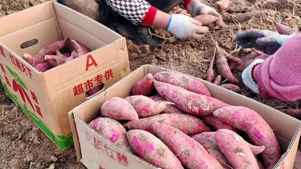 近日,黄湾镇砂坝村刘沟庄的300多亩红薯基地里,村民们正在忙碌地收获。翻土、分拣、装箱,一道道工序井然有序。