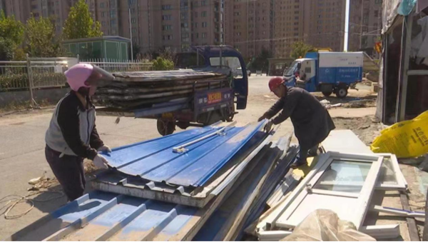 在滨河社区办公室南300米处道路西侧,私搭乱建、占道经营者主动积极对违章建筑进行拆除,此处之前是闲置土地,居民利用这块地方搭建了简易房,做起了生意。