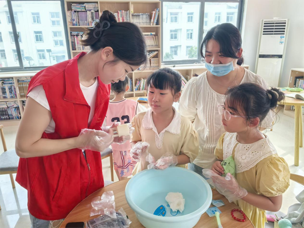 首先,志愿者们向在场参加活动人员介绍了中秋节的由来、风俗习惯,然后将桌布、馅料、面粉、模具、口罩等工具材料准备妥当,让留守儿童们亲手学做月饼,体验做月饼的乐趣。青年志愿者一边向孩子讲解如何制作月饼,一边演示给孩子看,之后留守儿童一起和冰皮粉、揉粉团、搓馅料、包月饼、压模、脱模……大家各司其职,互相协作,忙得不亦乐乎。