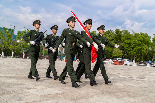 上午8时,升国旗仪式正式开始。国旗护卫队迈着铿锵有力的步伐,护卫着国旗走向升旗台。