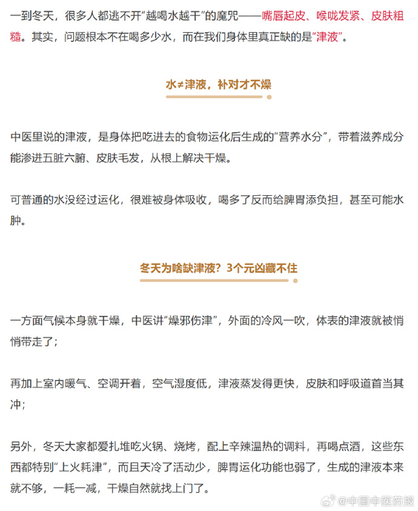一到冬天,很多人都逃不开“越喝水越干”的魔咒——嘴唇起皮、喉咙发紧、皮肤粗糙#冬天为什么越喝水越干#。其实,问题根本不在喝多少水,而在我们身体里真正缺的是“津液”。