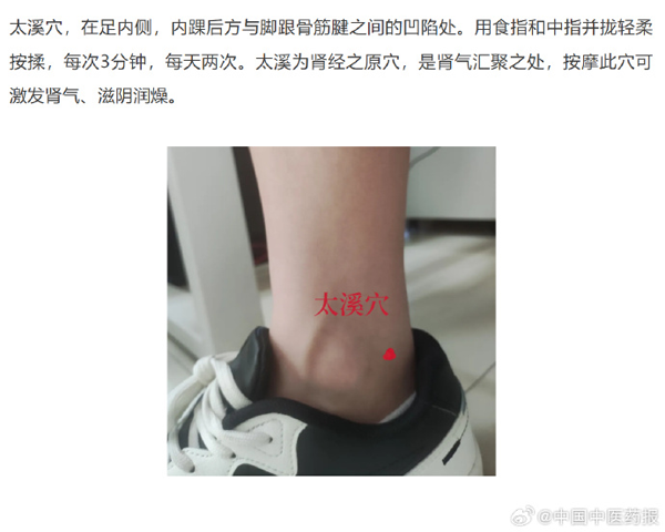 太溪穴(内踝后凹陷处):揉 3 分钟,滋阴润燥养肾气。